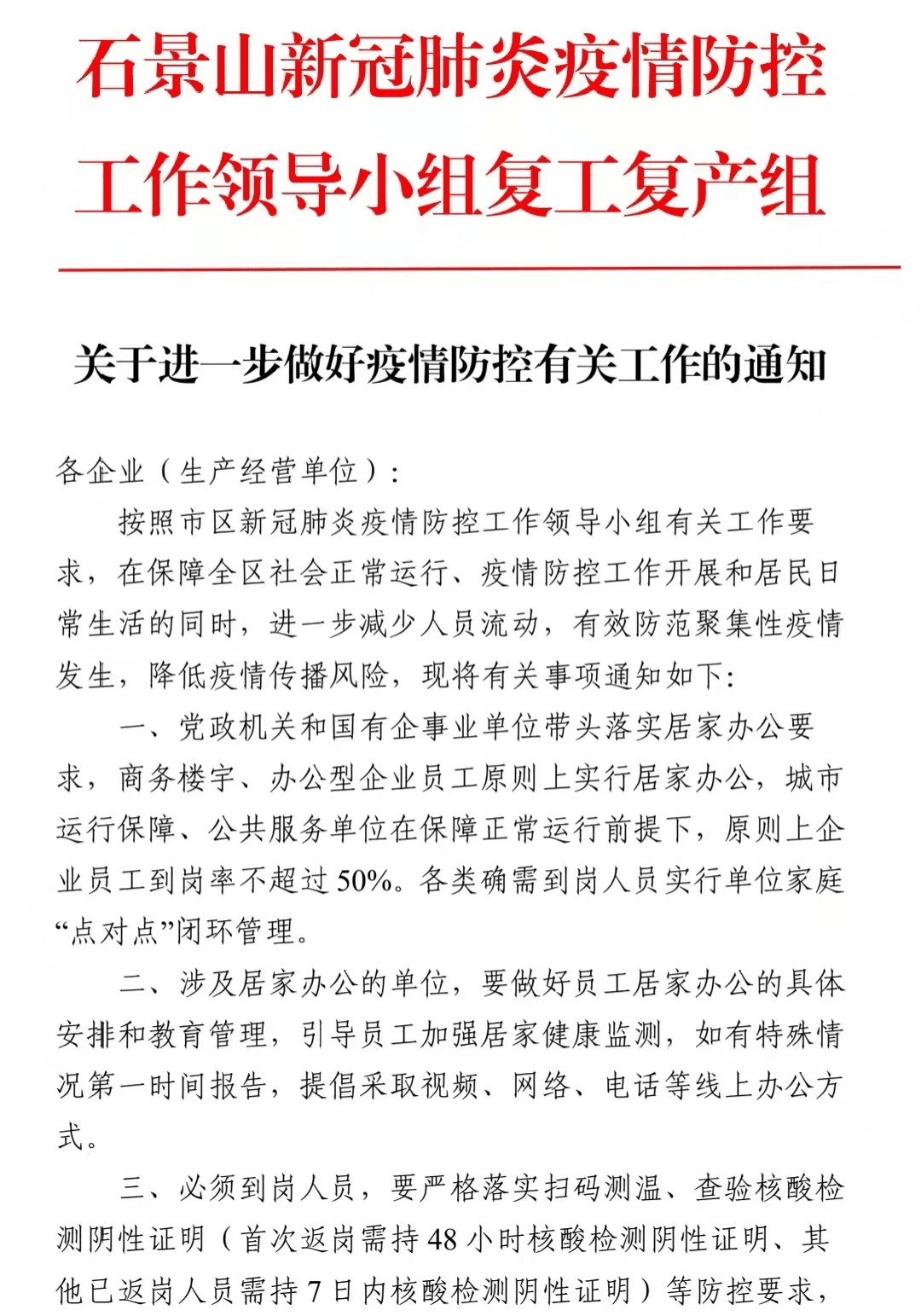 石景山區(qū)新冠肺炎疫情防控工作領(lǐng)導(dǎo)小組復(fù)工復(fù)產(chǎn)組發(fā)布《關(guān)于進(jìn)一步做好疫情防控有關(guān)工作的通知》,要求黨政機(jī)關(guān)和國(guó)有企事業(yè)單位帶頭落實(shí)居家辦公要求,商務(wù)樓宇、辦公型企業(yè)員工原則上實(shí)行居家辦公,城市運(yùn)行保障、公共服務(wù)單位在保障正常運(yùn)行前提下,原則上企業(yè)員工到崗率不超過50%,各類確需到崗人員實(shí)行單位家庭“點(diǎn)對(duì)點(diǎn)”閉環(huán)管理。