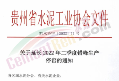 貴州省水泥工業(yè)協(xié)會(huì)發(fā)布《關(guān)于延長2022年二季度錯(cuò)峰生產(chǎn)停窯的通知》要求貴州區(qū)域所有水泥熟料生產(chǎn)線二季度每條生產(chǎn)線精準(zhǔn)錯(cuò)峰生產(chǎn)共計(jì)45天。
