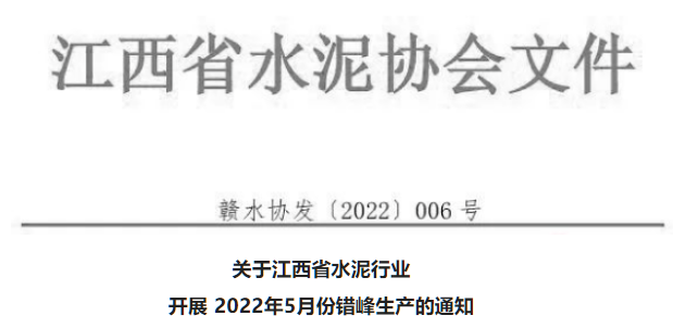 江西省發(fā)布關(guān)于水泥行業(yè)開展2022年5月份錯(cuò)峰生產(chǎn)的通知,要求江西省境內(nèi)49條水泥熟料生產(chǎn)線5月10日00:00-5月19日24:00,錯(cuò)峰生產(chǎn)10天。