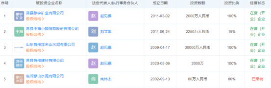 企業(yè)對外投資五家企業(yè),其中莒縣麒宇礦業(yè)有限公司、莒縣中海小額貸款股份有限公司、山東莒州浮來山水泥有限公司、莒縣建材有限公司四家尚在正常營業(yè)。企業(yè)對莒縣麒宇礦業(yè)有限公司、山東莒州浮來山水泥有限公司、莒縣建材有限公司為100%控股,莒縣中海小額貸款股份有限公司持股15%。