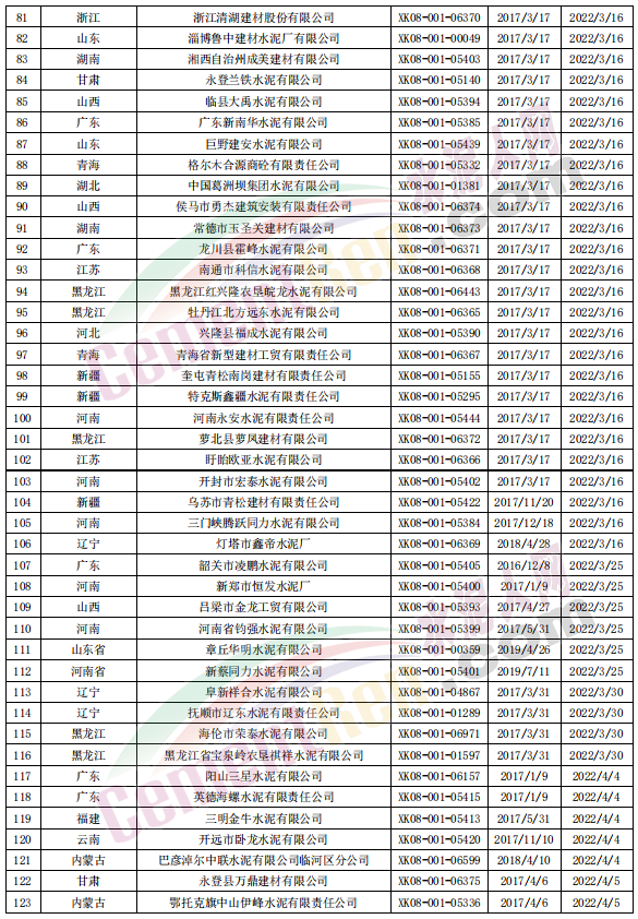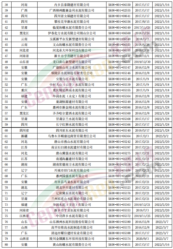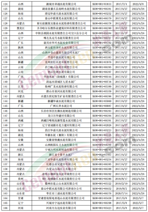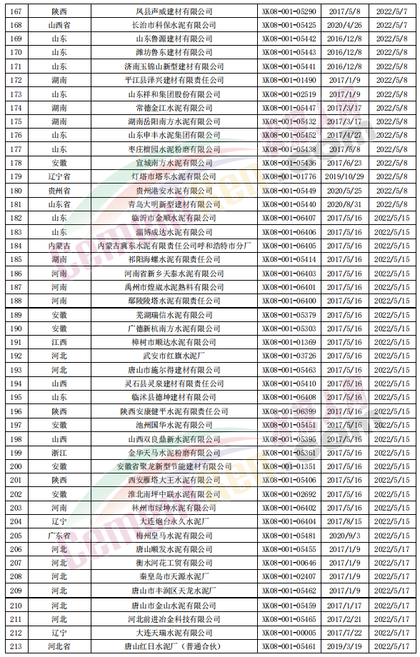 據(jù)查詢,市場監(jiān)管總局工業(yè)品生產(chǎn)許可證辦公室數(shù)據(jù)顯示2022年到期的生產(chǎn)許可證共個(gè)575個(gè)編號(hào),發(fā)證日期從2016年12月8日至2020年10月26日,有效期從2022年1月8日至2022年12月28日。其中2022年1-5月份到期的生產(chǎn)許可證共232個(gè)編號(hào),5月份以后到期的水泥生產(chǎn)企業(yè)大約有300多家。