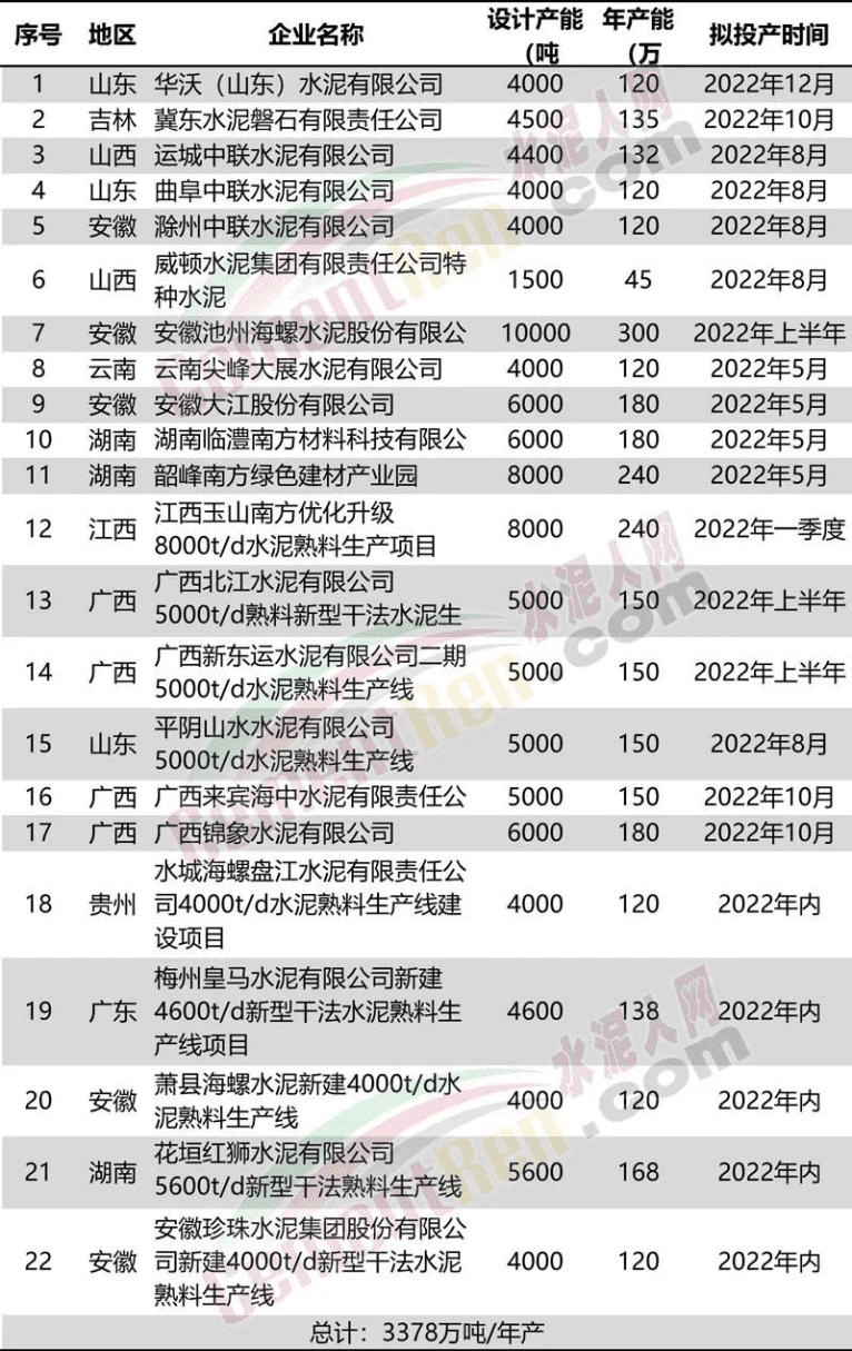 據(jù)水泥人網(wǎng)此前消息,原計(jì)劃于今年內(nèi)投產(chǎn)的22條熟料生產(chǎn)線項(xiàng),目前已點(diǎn)火和已開建,且明確今年內(nèi)點(diǎn)火投產(chǎn)的項(xiàng)目共11條線分別為:1 江西玉山南方8000t/d水泥熟料生產(chǎn)線于2020年12月23日開工,原計(jì)劃于今年一季度點(diǎn)火投產(chǎn)。目前熟料項(xiàng)目已經(jīng)達(dá)產(chǎn),日產(chǎn)量在9800-10200噸,道路和綠化是還在施工中;2 廣西新東運(yùn)水泥5000t/d水泥熟料生產(chǎn)線,已點(diǎn)火;3 韶峰南方8000t/d水泥熟料生產(chǎn)線,已點(diǎn)火;4 廣西錦象水泥6000t/d水泥熟料生產(chǎn)線一線暫定7月8日點(diǎn)火投產(chǎn),二線暫定下半年點(diǎn)火投產(chǎn);5 廣西都安上峰水泥一線5000t/d熟料生產(chǎn)線計(jì)劃于7月投產(chǎn);6 平陰山水水泥5000t/d水泥熟料生產(chǎn)線,計(jì)劃于8月點(diǎn)火;7 池州海螺10000t/d水泥熟料生產(chǎn)線,計(jì)劃于8月點(diǎn)火投產(chǎn);8 廣西北江水泥5000t/d水泥熟料生產(chǎn)線,原計(jì)劃上半年投產(chǎn),目前仍處于建設(shè)和設(shè)備調(diào)試中。上周內(nèi)回轉(zhuǎn)窯筒體吊裝合攏,預(yù)計(jì)于今年下半年內(nèi)點(diǎn)火投產(chǎn);9 水城海螺盤江水泥4000t/d水泥熟料生產(chǎn)線已開工建設(shè),原計(jì)劃于2022年底前點(diǎn)火投產(chǎn);10 安徽珍珠水泥4000t/d水泥熟料生產(chǎn)線已開工建設(shè),原計(jì)劃于今年內(nèi)點(diǎn)火投產(chǎn)。