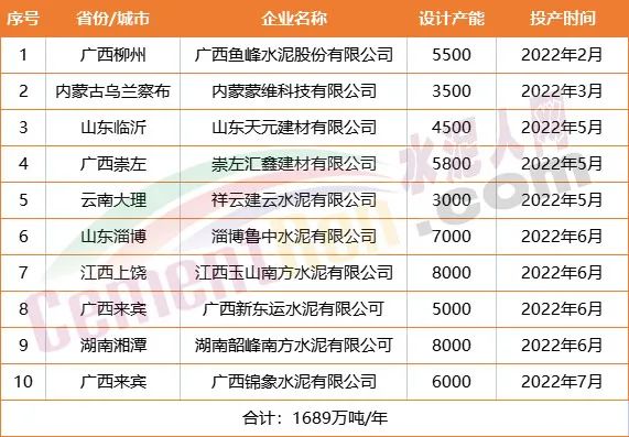 據(jù)水泥人網(wǎng)不完全統(tǒng)計,今年內(nèi)共投產(chǎn)水泥熟料產(chǎn)線10條,合計熟料產(chǎn)能1689萬噸。僅廣西區(qū)域就有4條水泥熟料生產(chǎn)線,熟料產(chǎn)能合計達669萬噸/年。