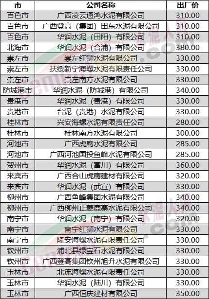 廣西區(qū)域P.O42.5散裝水泥出廠參考價