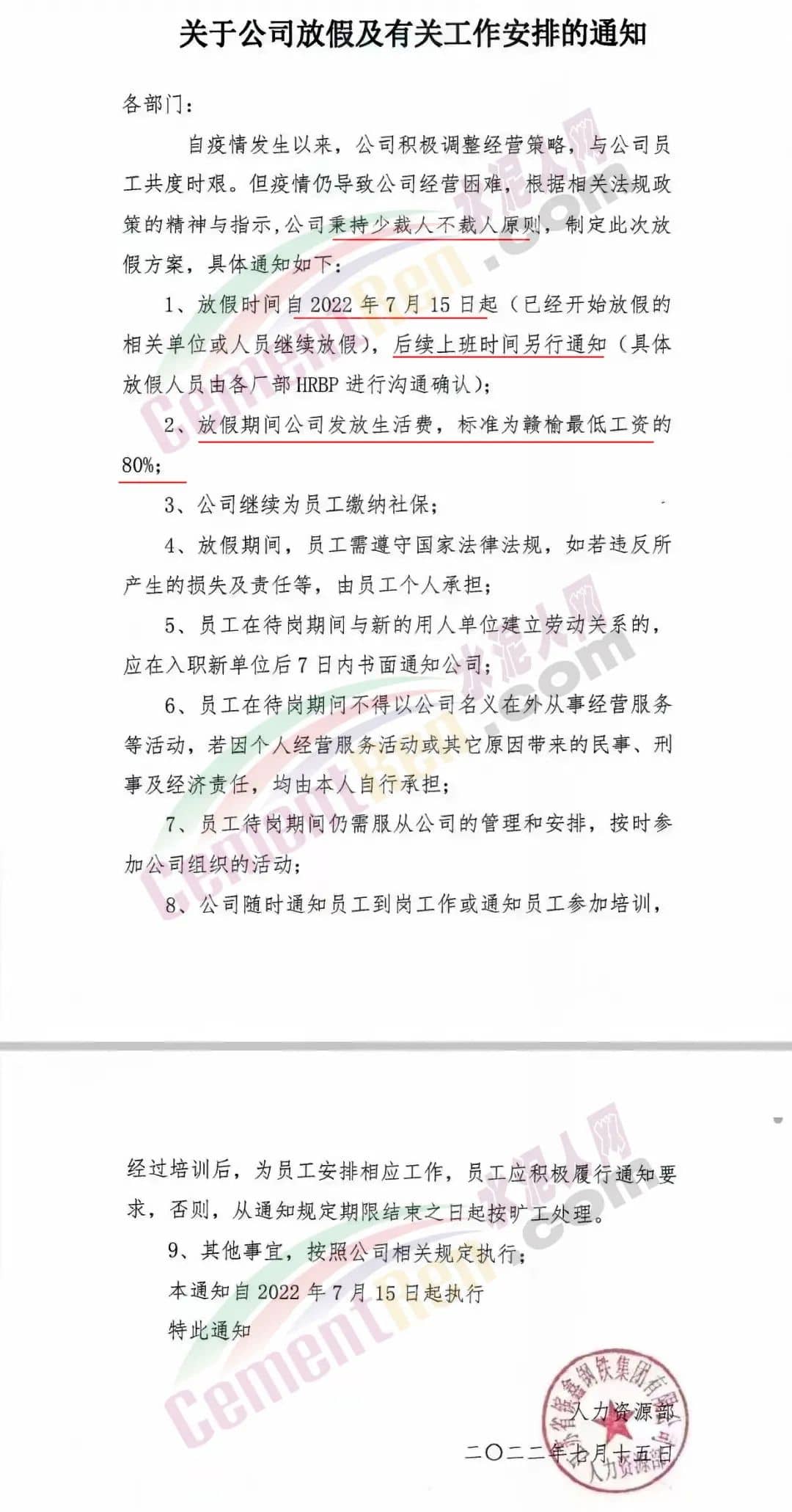 日前,江蘇一家鋼鐵公司發(fā)放假通知稱,自疫情發(fā)生以來,公司積極調(diào)整經(jīng)營策略,與公司員工共度時(shí)艱。但疫情仍導(dǎo)致公司經(jīng)營困難,根據(jù)相關(guān)法規(guī)政策的精神與指示,公司秉持少裁人不裁人原則,制定放假方案。放假時(shí)間自2022年7月15日起,后續(xù)上班時(shí)間另行通知;放假期間公司發(fā)放生活費(fèi),標(biāo)準(zhǔn)為贛榆最低工資的80%……