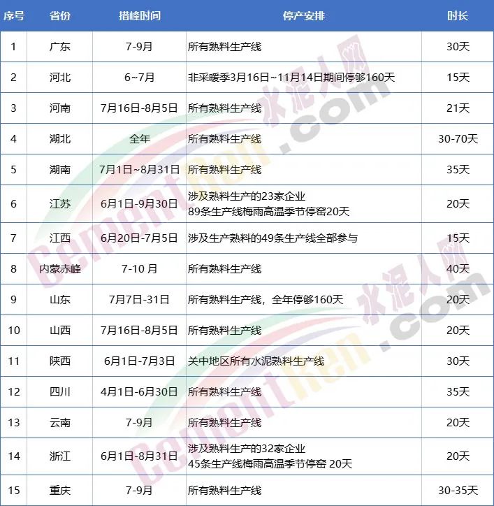 上述15個(gè)區(qū)域內(nèi)夏季錯(cuò)峰通知多要求所有熟料生產(chǎn)線參與錯(cuò)峰生產(chǎn)。據(jù)水泥人網(wǎng)不完全統(tǒng)計(jì)上述15個(gè)區(qū)域共有水泥熟料生產(chǎn)線約800多條,其中四川、云南、河南、山東、河北、湖南等省份均為水泥熟料大省。全國將有半數(shù)以上的省份停窯限產(chǎn),全國有接近三分之二的窯線開啟淡季錯(cuò)峰。