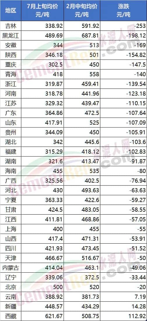 據(jù)水泥人網(wǎng)信息中心監(jiān)控?cái)?shù)據(jù)顯示,今年2月中旬至本月上旬 ,全國(guó)31個(gè)省市自治區(qū)中黑龍江、安徽、陜西、重慶、青海、浙江、河南、江蘇、廣東、山東、貴州、湖北、福建等14個(gè)區(qū)域水泥價(jià)格下跌100元/噸以上。其中吉林省均價(jià)下跌達(dá)253元/噸,黑龍江下跌198.12元/噸,安徽下跌169元/噸,陜西下跌154元/噸……