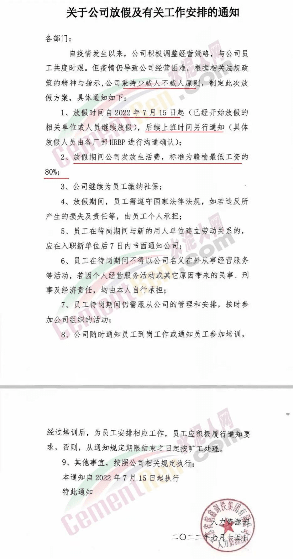 江蘇鑌鑫鋼鐵發(fā)放假通知稱,自2022年7月15日起放假,后續(xù)上班時(shí)間另行通知;放假期間公司發(fā)放生活費(fèi),標(biāo)準(zhǔn)為贛榆最低工資的80%……