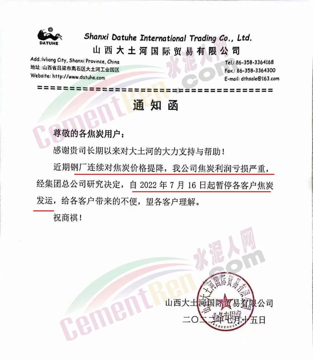 山西大土河國(guó)際貿(mào)易有限公司發(fā)通知函稱,近期鋼廠連續(xù)對(duì)焦炭?jī)r(jià)格提降,公司焦炭利潤(rùn)虧損嚴(yán)重,經(jīng)集團(tuán)總公司研究決定,自7月16日起暫停各客戶焦炭發(fā)運(yùn)。