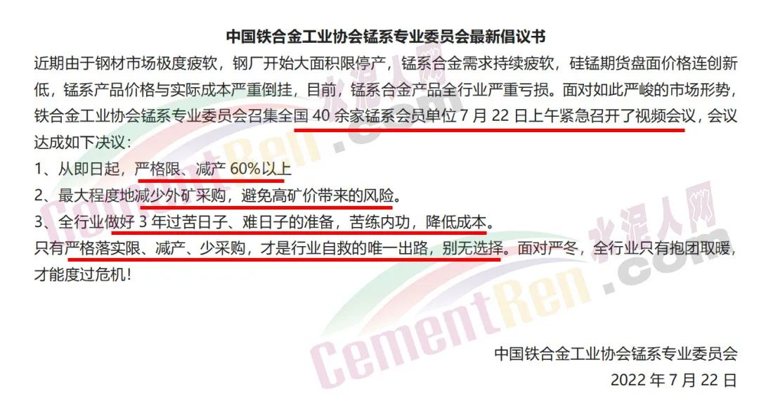 鐵合金工業(yè)協(xié)會(huì)錳系專業(yè)委員會(huì)召集全國(guó)40余家錳系會(huì)員單位7月22日上午緊急召開了視頻會(huì)議,會(huì)議達(dá)成決議:從即日起,嚴(yán)格限、減產(chǎn)60%以上;最大程度地減少外礦采購(gòu),避免高礦價(jià)帶來(lái)的風(fēng)險(xiǎn);全行業(yè)做好3年過(guò)苦日子、難日子的準(zhǔn)備,苦練內(nèi)功,降低成本。