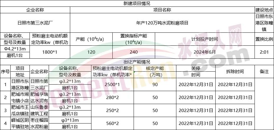 年產(chǎn)100萬噸水泥粉磨項(xiàng)目產(chǎn)能置換情況表