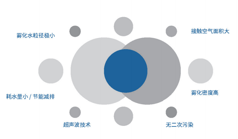 微米級(jí)干霧是采用超聲波技術(shù)使水霧化成超細(xì)的水滴,超聲波霧化水霧粒徑<10μm,與空氣接觸面積大,霧化密度高,能使含塵區(qū)濕度迅速達(dá)到飽和,不僅能滿足改善呼吸性粉塵濕潤(rùn)性所需要的條件,還能通過(guò)云物理學(xué)、空氣動(dòng)力學(xué)的輸送等多種機(jī)理實(shí)現(xiàn)"呼吸性粉塵"的捕集。此技術(shù)除塵效率高,特別是對(duì)于微細(xì)粒徑的呼吸性粉塵,除具有傳統(tǒng)濕式除塵器優(yōu)點(diǎn)之外,更主要的優(yōu)點(diǎn)是∶其霧化水顆粒粒徑特別小,容易與粉塵顆粒結(jié)合而凝聚沉降下來(lái),節(jié)能減排。耗水量小,物料濕度增加重量比僅為0.02%-0.05%,無(wú)二次污染。