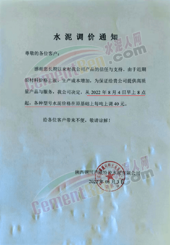 陜西銅川聲威特種水泥有限公司通知,由于近期原材料價格上漲,生產(chǎn)成本增加。公司決定,從8月4日早8點起,各型號水泥價格上調(diào)40元/噸。