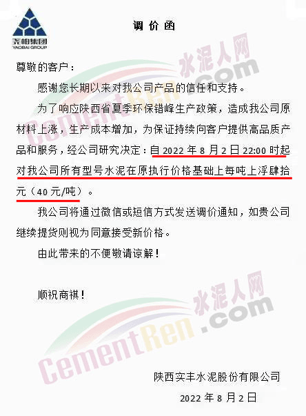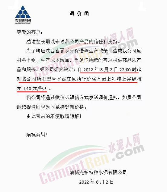堯柏集團旗下西安藍田堯柏水泥有限公司、陜西實豐水泥股份有限公司、蒲城堯柏特種水泥有限公司等多家公司通知,因原材料價格上漲,錯峰生產(chǎn)時間長,導致公司生產(chǎn)成本增加,經(jīng)公司研究決定,自8月2日22時起對公司所有型號水泥在原執(zhí)行價格基礎(chǔ)上上調(diào)40元/噸。公司將通過微信或短信方式發(fā)送調(diào)價通知,如客戶繼續(xù)提貨則視為同意接受新價格。