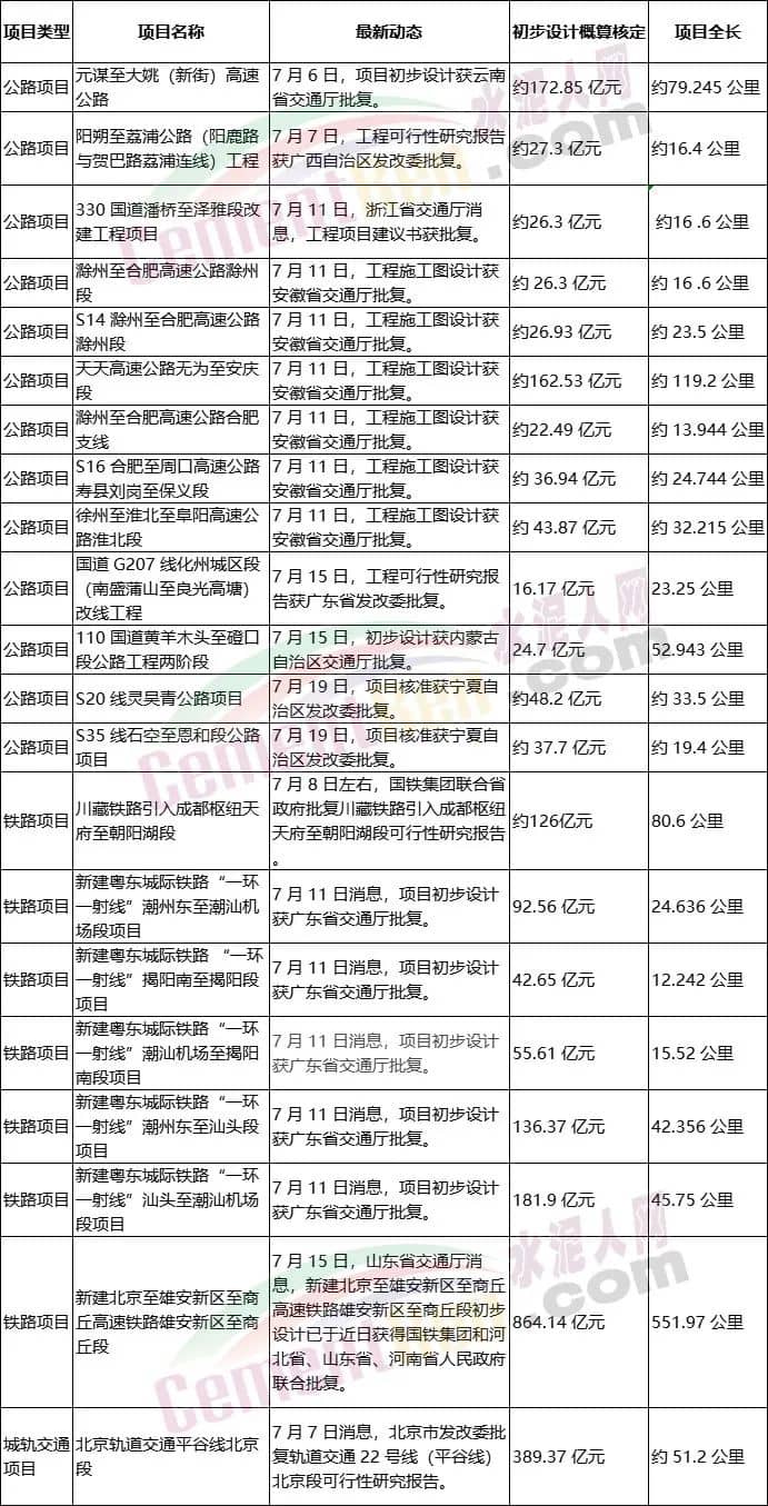 據(jù)水泥人網(wǎng)了解,自 7 月份以來,各省市發(fā)改委、交通運輸廳累計批復了 12 項公路項目、7 項鐵路工程以及 1 項城軌交通項目,批復內(nèi)容包括工程可行性研究報告、初步設(shè)計以及項目立項核準,各類項目總投資額分別為 646 億元、1499 億元和 389 億元,合計總投資額 2534 億元。具體的項目批復情況如下: