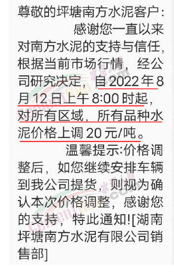 坪塘南方水泥通知,根據(jù)當(dāng)前市場(chǎng)行情,經(jīng)公司研究決定,自2022年8 月12日上午8∶00時(shí)起,對(duì)所有區(qū)域,所有品種水泥價(jià)格上調(diào)20元/噸。