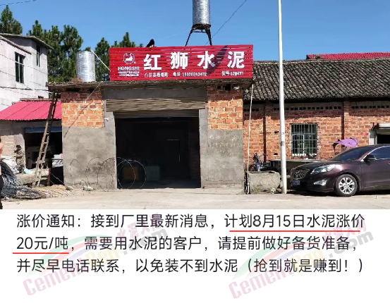 紅獅水泥經(jīng)銷商通知∶接到廠里最新消息,計(jì)劃8月15日水泥漲價(jià)20元/噸,需要用水泥的客戶,請(qǐng)?zhí)崆白龊脗湄洔?zhǔn)備,并盡早聯(lián)系,以免裝不到水泥(搶到就是賺到)。