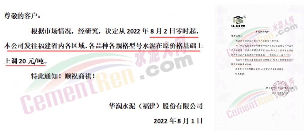 近來(lái)多區(qū)域通知上調(diào)水泥價(jià)格。日前,桃江南方水泥通知,根據(jù)當(dāng)前市場(chǎng)行情,經(jīng)公司研究決定自2022年8月12日08時(shí)起,對(duì)長(zhǎng)沙市(含寧鄉(xiāng)),湘陰縣所有品種包、散裝水泥價(jià)格上調(diào)20元/噸。價(jià)格調(diào)整后,如繼續(xù)安排車輛到公司提貨,則視為確認(rèn)本次調(diào)整。
