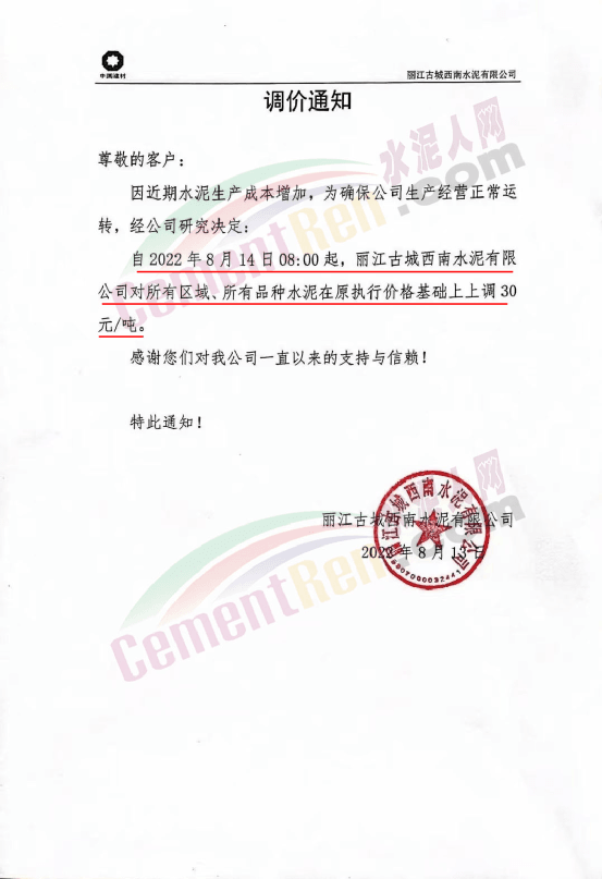 日前,麗江古城西南水泥有限公司通知,因近期水泥生產(chǎn)成本增加,為確保公司生產(chǎn)經(jīng)營正常運(yùn)轉(zhuǎn),經(jīng)公司研究決定,自8月14日8時(shí)起,公司對(duì)所有區(qū)域、所有品種水泥在原執(zhí)行價(jià)格基礎(chǔ)上上調(diào)30元/噸。