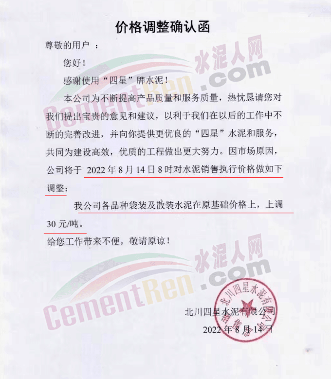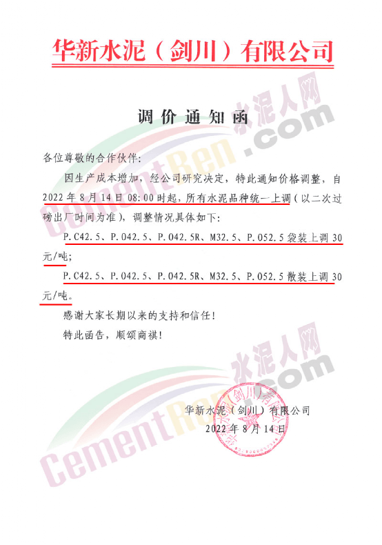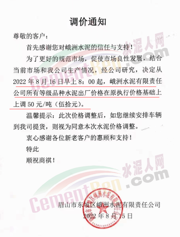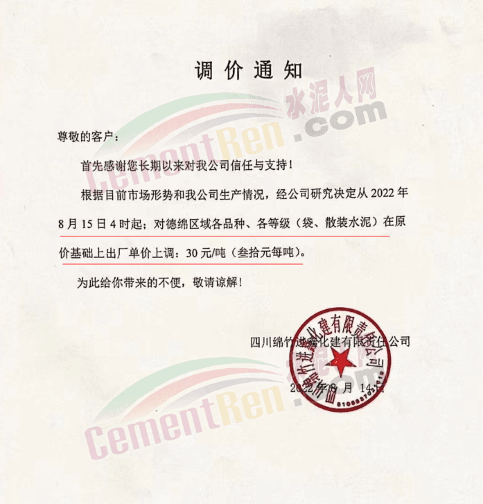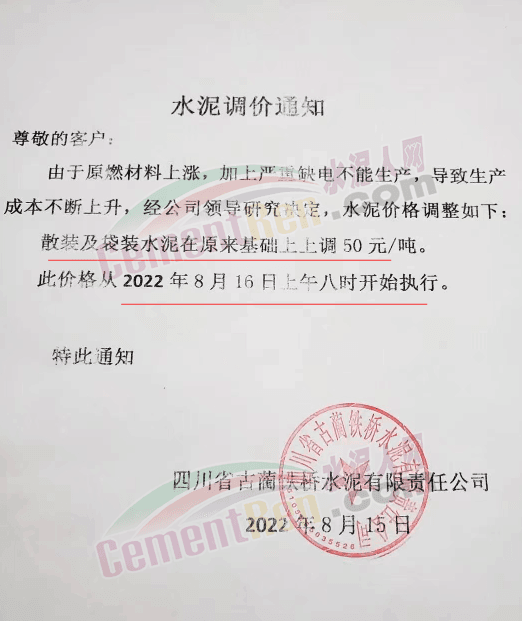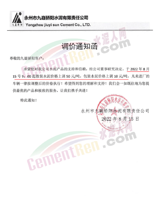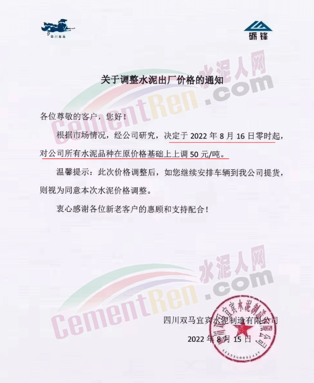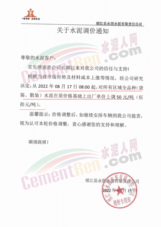 綏江永固水泥有限責(zé)任公司通知,從2022年08月17日08:00起,對(duì)所有區(qū)域全品種(袋裝、散裝)水泥在原價(jià)格基礎(chǔ)上出廠單價(jià)上調(diào)50元/噸。