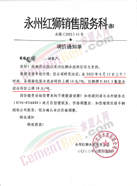 水泥人網(wǎng)注意到,湖南永州紅獅水泥銷售服務(wù)科通知根據(jù)當(dāng)前市場(chǎng)行情,經(jīng)公司研究決定,自2022年8月15日上午7時(shí)起,各規(guī)格包裝水泥合同價(jià)上調(diào)10元/噸,紅獅牌P.042.5散裝水泥合同價(jià)上調(diào)50元/噸。價(jià)格調(diào)整后,如繼續(xù)安排車輛到公司提貨,視為確認(rèn)本次價(jià)格調(diào)整。