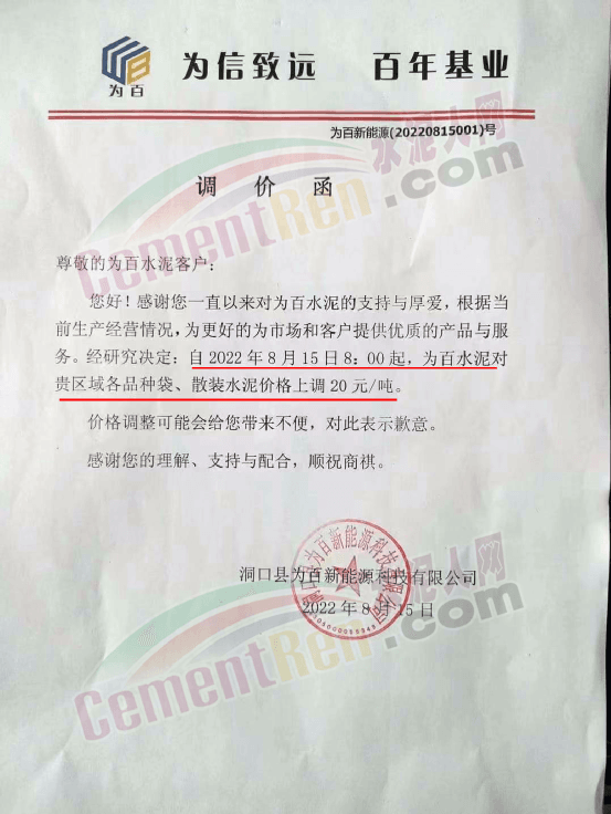 湖南洞口縣為百新能源科技有限公司通知,根據(jù)當(dāng)前生產(chǎn)經(jīng)營情況,自8月15日8時(shí)起,為百水泥對(duì)各品種袋、散裝水泥價(jià)格上調(diào)20元/噸。
