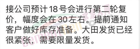 水泥銷售通知,接公司通知預(yù)計(jì)18日會(huì)進(jìn)行第二輪復(fù)價(jià),幅度會(huì)在30元/噸左右。提前通知客戶做好庫存準(zhǔn)備,大田紅獅發(fā)貨已經(jīng)需要限量發(fā)貨。