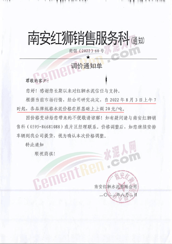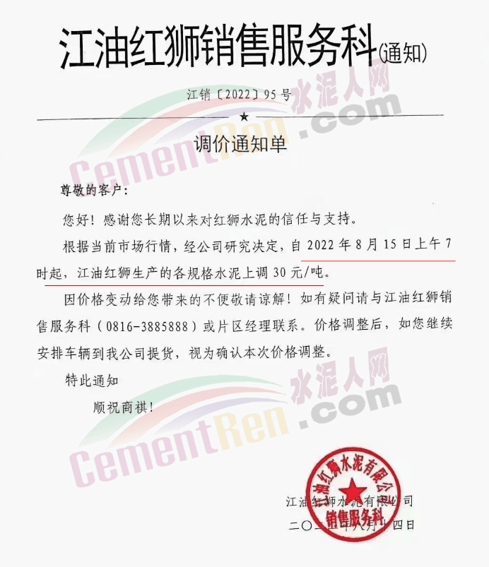 江油紅獅銷售服務(wù)科通知,根據(jù)當(dāng)前市場(chǎng)行情,經(jīng)公司研究決定,自2022年8月15日上午7時(shí)起,江油紅獅生產(chǎn)的各規(guī)格水泥上調(diào)30元/噸。價(jià)格調(diào)整后,如您繼續(xù)安排車輛到我公司提貨,視為確認(rèn)本次價(jià)格調(diào)整。