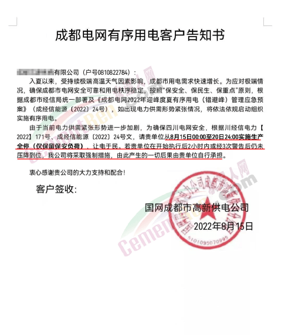 據(jù)水泥人網(wǎng)了解,國網(wǎng)成都市高新供電公司發(fā)布《成都電網(wǎng)有序用電客戶告知書》稱,入夏以來,受持續(xù)極端高溫天氣因素影響,成都市用電需求快速增長(zhǎng)。為應(yīng)對(duì)極端情況,確保成都市電網(wǎng)安全可靠和用電秩序穩(wěn)定,按照“保安全、保民生、保重點(diǎn)”原則,根據(jù)成都市經(jīng)信局統(tǒng)一一部署及相關(guān)文件要求,如出現(xiàn)電力供需形勢(shì)緊張情況,將依法依規(guī)啟動(dòng)組織實(shí)施有序用電。