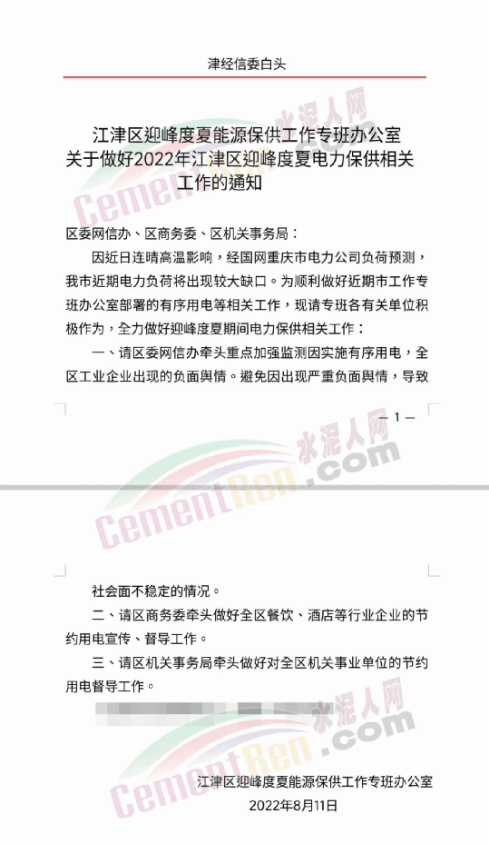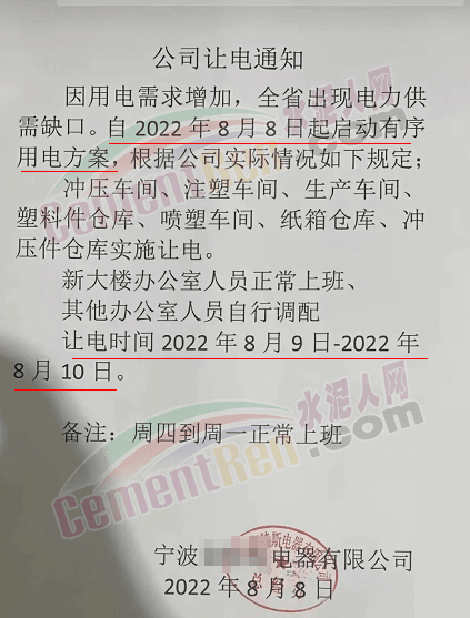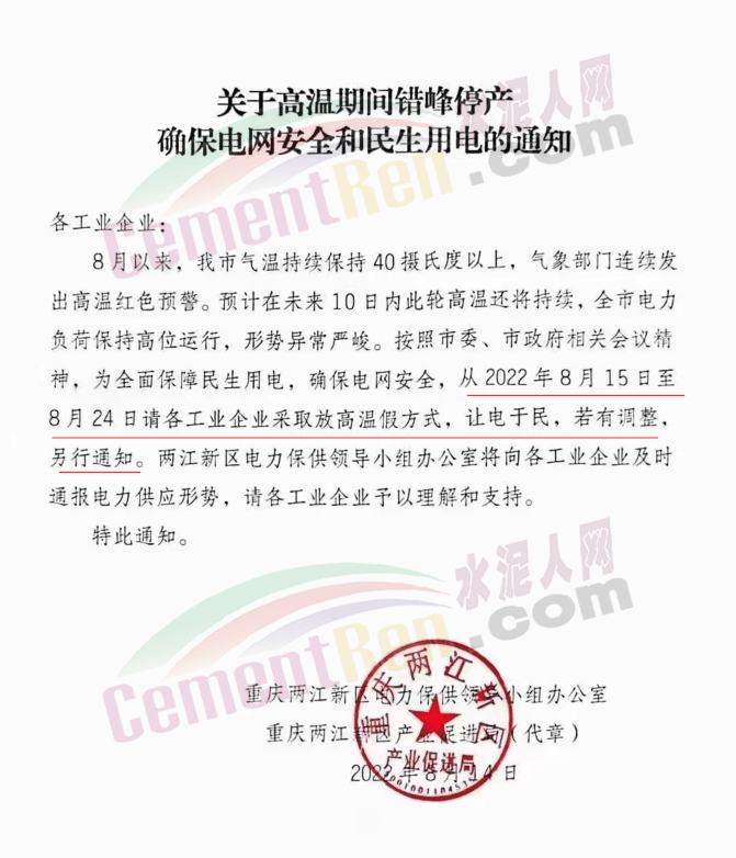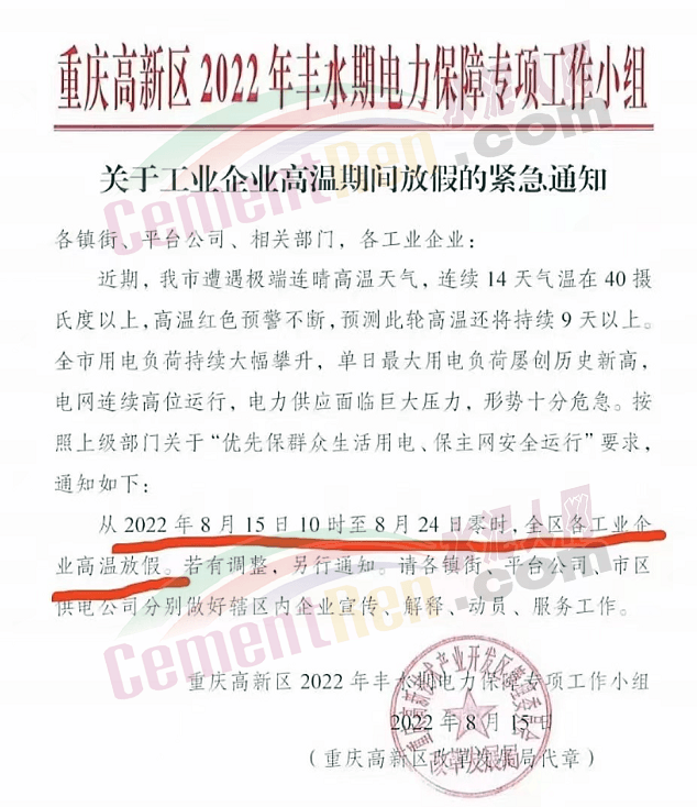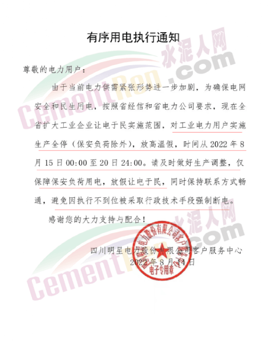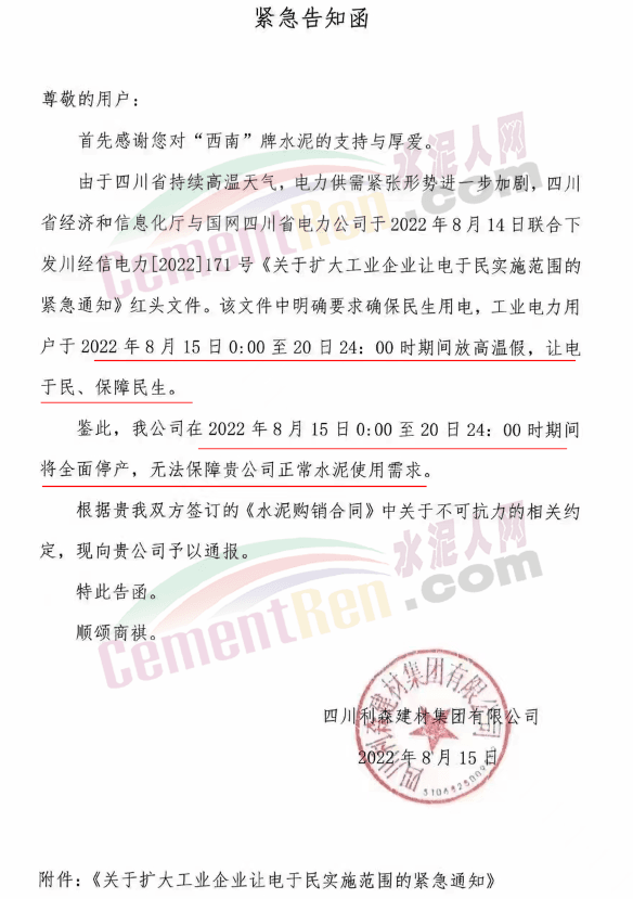 四川峨眉山西南水泥有限公司發(fā)《緊急告知函》稱,由于四川省持續(xù)高溫天氣,電力供需緊張形勢(shì)進(jìn)一步加劇,四川省經(jīng)濟(jì)和信息化廳與國網(wǎng)四川省電力公司于2022年8月14日聯(lián)合下發(fā)川經(jīng)信電力[2022]171號(hào)《關(guān)于擴(kuò)大工業(yè)企業(yè)讓電于民實(shí)施范圍的緊急通知》紅頭文件,該文件明確要求確保民生用電,工業(yè)電力用戶于2022年8月15日00:00時(shí)至20日24:00時(shí)間高溫假,讓電于民。鑒此,公司在2022年8月15日00:00時(shí)至20日24:00時(shí)期間將全面停工停產(chǎn)。