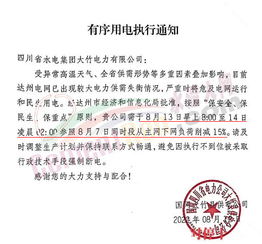 四川省水電集團(tuán)大竹電力有限公司發(fā)布《有序用電執(zhí)行通知》稱,受異常高溫天氣、全省供需形勢(shì)等多重因素疊加影響,目前達(dá)州電網(wǎng)已出現(xiàn)較大電力供需失衡情況,嚴(yán)重時(shí)將危及電網(wǎng)運(yùn)行和民生用電。經(jīng)達(dá)州市經(jīng)濟(jì)和信息化局批準(zhǔn),按照“保安全、保民生(保重點(diǎn)”原則,貴公司需于8月13日早上8∶00至14日凌晨2∶00參照8月7日同時(shí)段從主網(wǎng)下網(wǎng)負(fù)荷削減15%。請(qǐng)及時(shí)調(diào)整生產(chǎn)計(jì)劃并保持聯(lián)系方式暢通,避免因執(zhí)行不到位被采取行政技術(shù)手段強(qiáng)制斷電。
