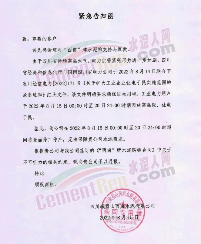 鑒此,公司在2022年8月15日0:00至20日24:00時(shí)期間將全面停產(chǎn),無法保障客戶正常水泥使用需求。根據(jù)貴我雙方簽訂的《水泥購銷合同》中關(guān)于不可抗力的相關(guān)約定,現(xiàn)向客戶予以通報(bào)。