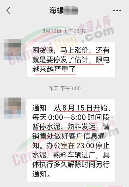 海螺水泥提醒經(jīng)銷商,“囤貨哦,馬上漲價(jià),還有就是要停發(fā)了估計(jì),限電越來越嚴(yán)重了。”并發(fā)出通知稱:“從8月15日開始,每天0時(shí)至8時(shí)時(shí)間段暫停水泥、熟料發(fā)運(yùn),請(qǐng)銷售處做好客戶信息通知。辦公室在23∶00停止水泥、熟料車輛進(jìn)廠,具體執(zhí)行多久解除時(shí)間另行通知。”