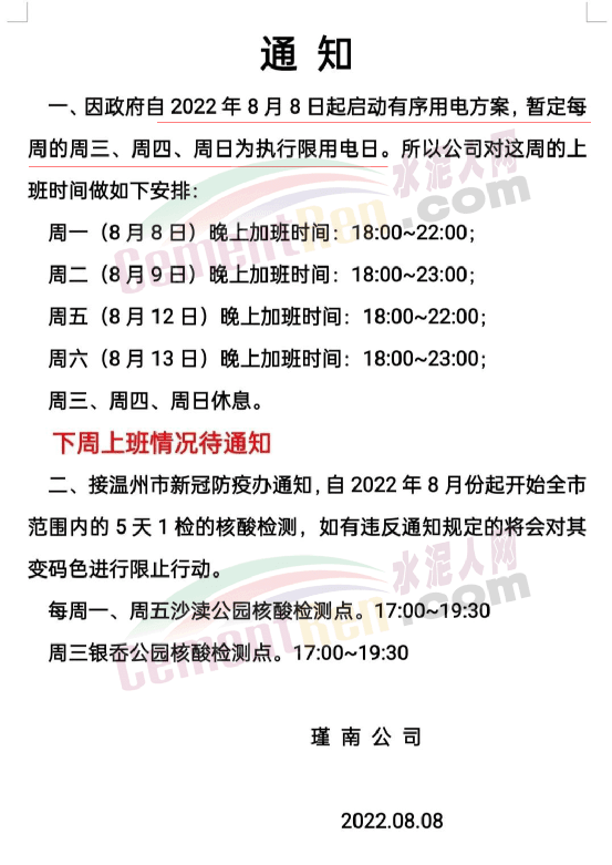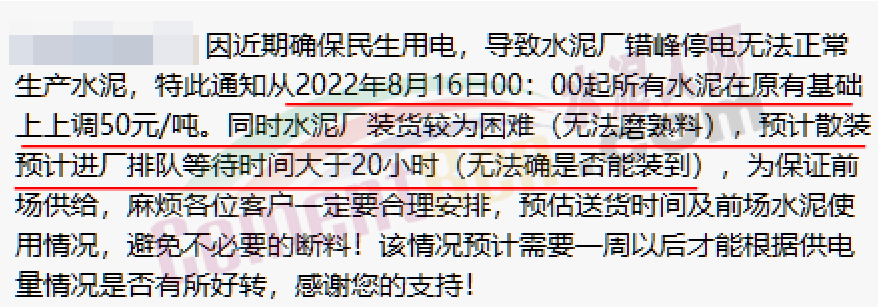 區(qū)域內(nèi)一家水泥企業(yè)緊急通知,因近期確保民生用電,導(dǎo)致水泥廠錯(cuò)峰停電無法正常生產(chǎn)水泥,特此通知!從2022年8月16日00:00起所有水泥在原有基礎(chǔ)上上調(diào)50元/噸。同時(shí)水泥廠裝貨較為困難(無法磨熟料),預(yù)計(jì)散裝預(yù)計(jì)進(jìn)廠排隊(duì)等待時(shí)間大于20小時(shí)(無法確是否能裝到),為保證前場(chǎng)供給,麻煩各位客戶一定要合理安排,預(yù)估送貨時(shí)間及前場(chǎng)水泥使用情況,避免不必要的斷料。該情況預(yù)計(jì)需要一周以后才能根據(jù)供電量情況是否有所好轉(zhuǎn)。