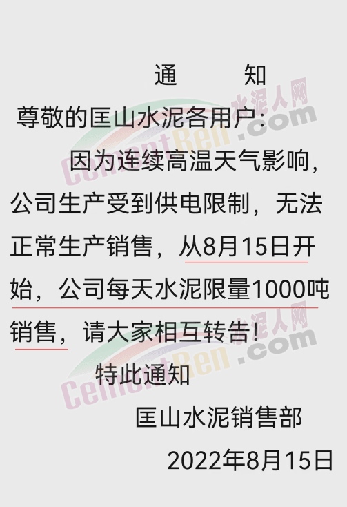 匡山水泥通知,從8月15起公司每天水泥限量1000噸銷售。