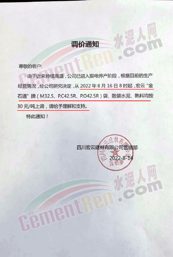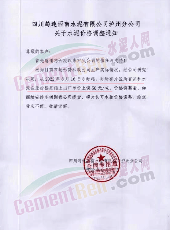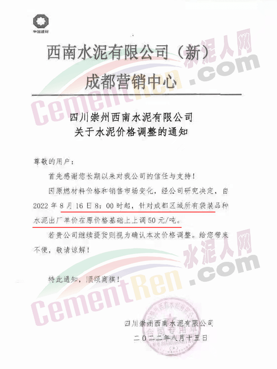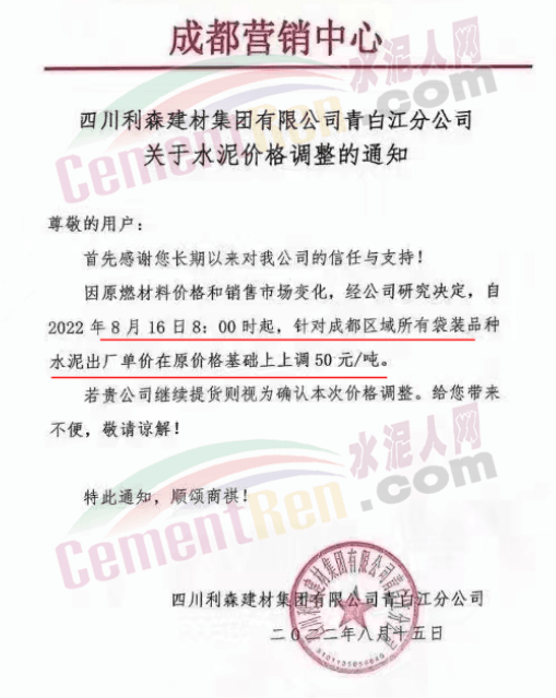 四川筠連西南水泥有限公司瀘州分公司通知,根據(jù)目前市場(chǎng)形勢(shì)和我公司生產(chǎn)實(shí)際情況,經(jīng)公司研究決定,從2022年8月16日8時(shí)起,對(duì)所有片區(qū)所有品種水泥在原價(jià)格基礎(chǔ)上出廠單價(jià)上調(diào)50元/噸。價(jià)格調(diào)整后,如繼續(xù)安排車輛到我公司提貨,視為認(rèn)可本輪價(jià)格調(diào)整。
