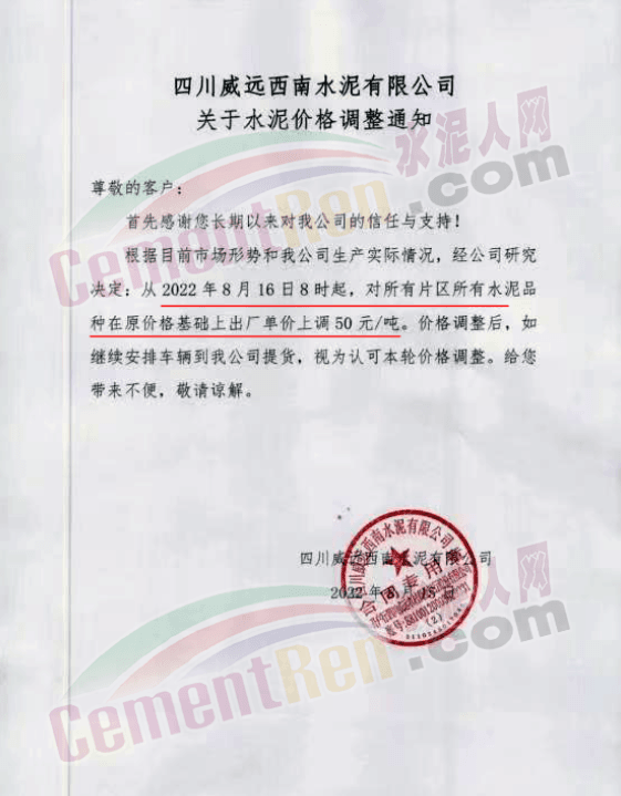 四川威遠(yuǎn)西南水泥有限公司通知,根據(jù)目前市場(chǎng)形勢(shì)和我公司生產(chǎn)實(shí)際情況,經(jīng)公司研究決定,從2022年8月16日8時(shí)起,對(duì)所有片區(qū)所有水泥品種在原價(jià)格基礎(chǔ)上出廠單價(jià)上調(diào)50元/噸。價(jià)格調(diào)整后,如繼續(xù)安排車輛到我公司提貨,視為認(rèn)可本輪價(jià)格調(diào)整。