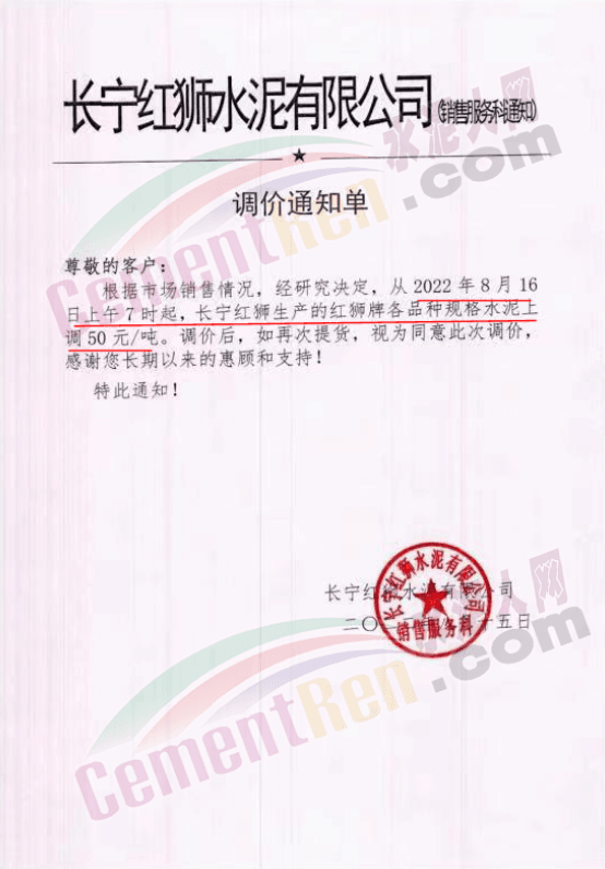 長(zhǎng)寧紅獅水泥有限公司銷售服務(wù)科通知根據(jù)市場(chǎng)銷售情況,經(jīng)研究決定,從2022年8月16日上午7時(shí)起,長(zhǎng)寧紅獅生產(chǎn)的紅獅牌各品種規(guī)格水泥上調(diào)50元/噸。調(diào)價(jià)后,如再次提貨,視為同意此次調(diào)價(jià)。