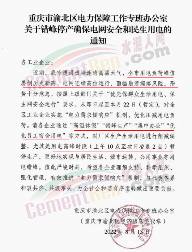 重慶市渝北區(qū)電力保障工作專班辦公室發(fā)布《關(guān)于錯(cuò)峰停產(chǎn)確保電網(wǎng)安全和民生用電的通知》給各工業(yè)企業(yè)稱,近期,重慶市遭遇極端連晴高溫天氣,全市用電負(fù)荷峰值屢創(chuàng)歷史新高,電網(wǎng)連續(xù)高位運(yùn)行,面臨崩潰癱瘓風(fēng)險(xiǎn),形勢(shì)十分危急。按照上級(jí)部門關(guān)于“優(yōu)先保群眾生活用電、保主網(wǎng)安全運(yùn)行”要求,從即日起至本月22日(暫定),對(duì)全區(qū)工業(yè)企業(yè)實(shí)施“電力需求側(cè)響應(yīng)”機(jī)制,優(yōu)化壓減用電負(fù)荷。請(qǐng)各企業(yè)通過“高溫休假”“錯(cuò)峰生產(chǎn)”“集中辦公”“優(yōu)化員工宿舍用電”等方式,對(duì)廠區(qū)生產(chǎn)生活用電進(jìn)行削減調(diào)整,尤其是用電高峰時(shí)段(上午10點(diǎn)至次日凌晨2點(diǎn))暫停生產(chǎn),更好地實(shí)現(xiàn)與居民生活、城市運(yùn)轉(zhuǎn)、公用事業(yè)等用電錯(cuò)峰。