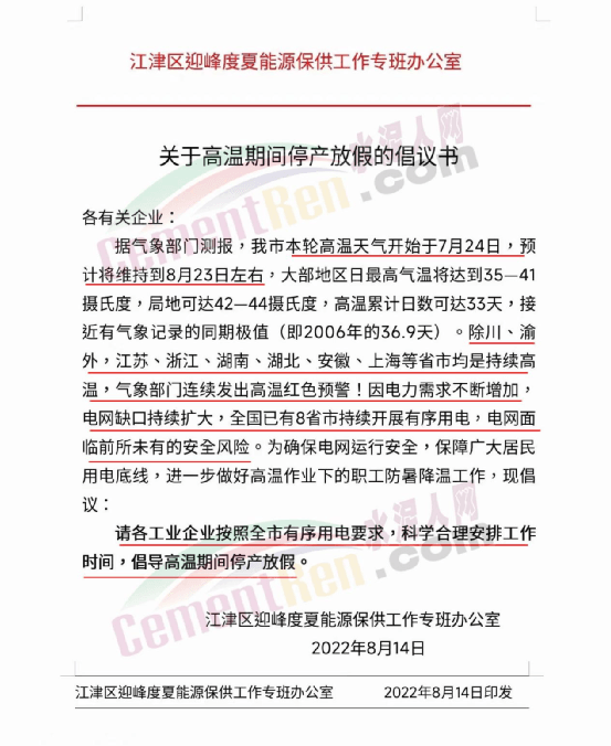 除川、渝外,江蘇、浙江、湖南、湖北、安徽、上海等省市均是持續(xù)高溫,氣象部門連續(xù)發(fā)出高溫紅色預(yù)警因電力需求不斷增加,電網(wǎng)缺口持續(xù)擴(kuò)大,全國已有8省市持續(xù)開展有序用電,電網(wǎng)面臨前所未有的安全風(fēng)險(xiǎn)。為確保電網(wǎng)運(yùn)行安全,保障廣大居民用電底線,進(jìn)一步做好高溫作業(yè)下的職工防暑降溫工作,現(xiàn)倡議各工業(yè)企業(yè)按照全市有序用電要求,科學(xué)合理安排工作時(shí)間,倡導(dǎo)高溫期間停產(chǎn)放假。