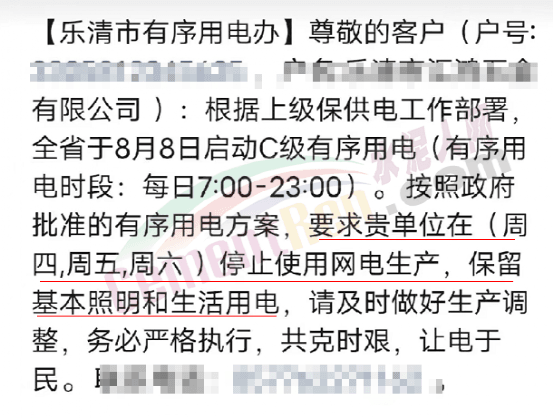 四川明星電力股份有限公司客戶服務(wù)中心發(fā)《有序用電執(zhí)行通知》給電力用戶稱,由于當(dāng)前電力供需緊張形勢(shì)進(jìn)一步加劇,為確保電網(wǎng)安全和民生用電,按照省經(jīng)信和省電力公司要求,現(xiàn)在全省擴(kuò)大工業(yè)企業(yè)讓電于民實(shí)施范圍,對(duì)工業(yè)電力用戶實(shí)施生產(chǎn)全停(保安負(fù)荷除外),放高溫假,時(shí)間從2022年8月15日00∶00至20日24∶00。請(qǐng)及時(shí)做好生產(chǎn)調(diào)整,僅保障保安負(fù)荷用電,放假讓電于民,同時(shí)保持聯(lián)系方式暢通,避免因執(zhí)行不到位被采取行政技術(shù)手段強(qiáng)制斷電。