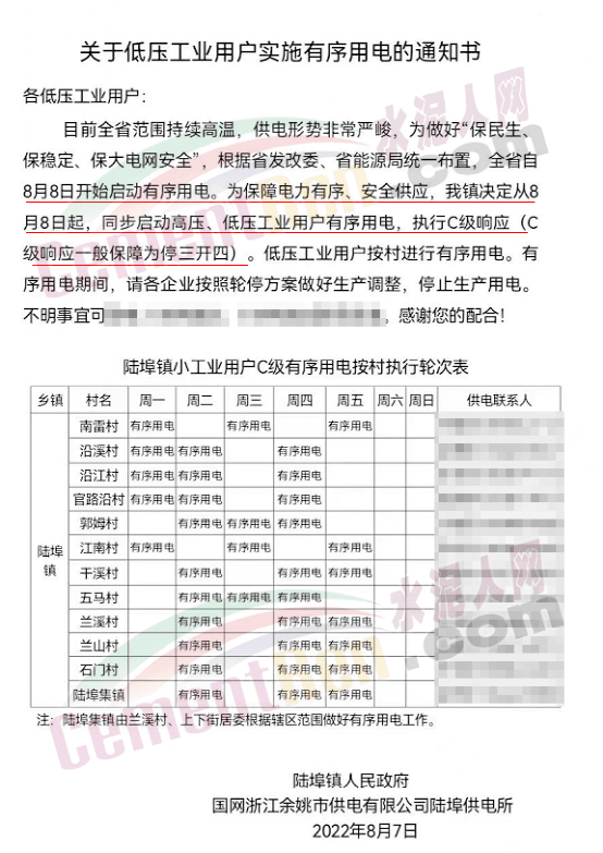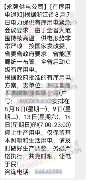 8月初,浙江省發(fā)改委發(fā)布《關(guān)于同意啟動(dòng)C級(jí)有序用電的函》給國網(wǎng)浙江電力有限公司稱,經(jīng)請(qǐng)示省政府同意,浙江省8月8日根據(jù)用電缺口實(shí)際情況啟動(dòng)C級(jí)1250萬千瓦有序用電措施,8月9日再視情況調(diào)整有序用電等級(jí)。請(qǐng)認(rèn)真做好有序用電細(xì)化措施,壓實(shí)各地責(zé)任,確保民生用電,絕不能拉閘限電。