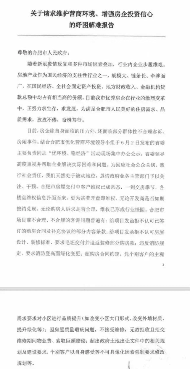 近日,一份寫給合肥市政府的、名為《關(guān)于請(qǐng)求維護(hù)營(yíng)商環(huán)境、增強(qiáng)房企投資信心的紓困解難報(bào)告》的文件流出,落款處蓋著保利、華潤(rùn)、綠城、龍湖、融創(chuàng)、旭輝和葛洲壩等17家品牌房企的印章。報(bào)告請(qǐng)求合肥政府:堅(jiān)決遏制專業(yè)房鬧及種種“惡意維權(quán)”行為。