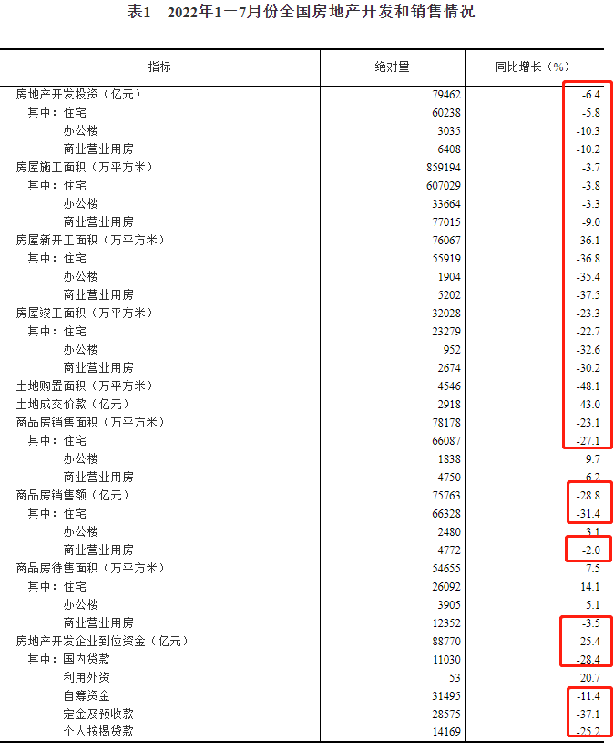 2022年下半年已開啟,全國(guó)樓市仍處于艱難尋底中,且下行態(tài)勢(shì)嚴(yán)峻。近日國(guó)家統(tǒng)計(jì)局發(fā)布7月份房地產(chǎn)相關(guān)數(shù)據(jù),所有指標(biāo)全部下跌。