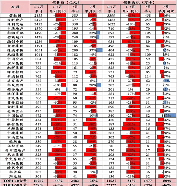 1—7月份,商品房銷售面積78178萬(wàn)平方米,同比下降23.1%;商品房銷售額75763億元,下降28.8%,7月末,商品房待售面積54655萬(wàn)平方米,同比增長(zhǎng)7.5%。