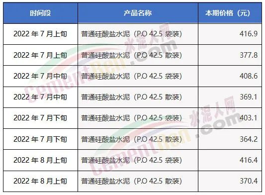 國家統(tǒng)計局數(shù)據(jù)顯示8月上旬水泥價格P.O42.5散裝水泥報價370.4元/噸,包裝水泥報價416.4元/噸。環(huán)比7月下旬散裝水泥上漲了6.2元/噸,包裝水泥上漲了13.3元/噸。但是,相比今年1月下旬,前七個月內(nèi)下跌超100元/噸。