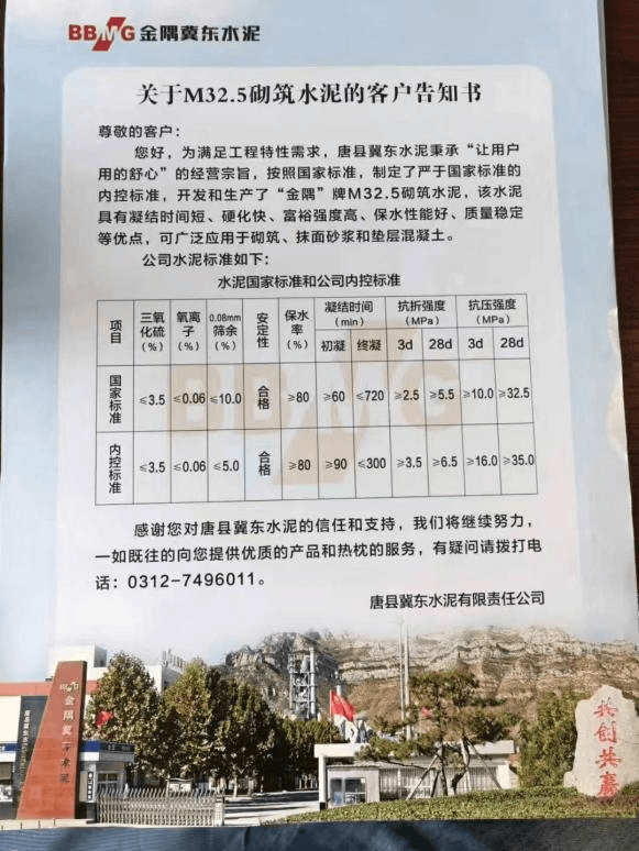 日前,唐縣冀東水泥有限責(zé)任公司通知客戶,為滿足工程特性需要,唐縣冀東秉承“讓用戶用的舒心“的經(jīng)營(yíng)宗旨,按照國(guó)家標(biāo)準(zhǔn),制定于嚴(yán)于國(guó)家標(biāo)準(zhǔn)的內(nèi)控標(biāo)準(zhǔn),開(kāi)發(fā)和生產(chǎn)了”金隅“牌M32.5砌筑水泥,該水泥具有凝結(jié)時(shí)間短、硬化快、富裕強(qiáng)度高、保水性能好、質(zhì)量穩(wěn)定等優(yōu)點(diǎn),可廣泛應(yīng)用于砌筑、抹面砂漿和墊層混凝土。