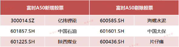 8月31日,國際指數(shù)編制公司富時羅素公布的富時全球股票指數(shù)系列的最新審議結(jié)果顯示,富時中國A50指數(shù)新增億緯鋰能、中國石油、陜西煤業(yè)為成分股,同時剔除了海螺水泥、中國太保、片仔癀。上述指數(shù)調(diào)整結(jié)果將于9月16日星期五收盤后(即9月19日星期一)生效。