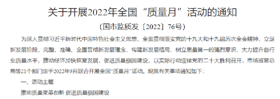 日前,國(guó)家市場(chǎng)監(jiān)管總局發(fā)布《關(guān)于開(kāi)展2022年全國(guó)“質(zhì)量月”活動(dòng)的通知》(國(guó)市監(jiān)質(zhì)發(fā)〔2022〕76號(hào))提到,市場(chǎng)監(jiān)管總局等21個(gè)部門(mén)定于2022年9月聯(lián)合開(kāi)展全國(guó)“質(zhì)量月”活動(dòng)?;顒?dòng)主題為“推動(dòng)質(zhì)量變革創(chuàng)新 促進(jìn)質(zhì)量強(qiáng)國(guó)建設(shè)”。
