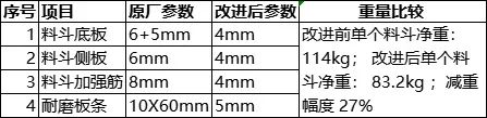 針對以上情況,建平華凱更換料斗材質,采用NM450 鋼板,徹底解決了磨損快、易變形等問題,在保證使用性能和壽命的同時,實現(xiàn)輕量化,降低運行負荷,同時提高了鏈條壽命。改造后料斗的壽命是原來的 2-3 倍,料斗減重 27%以上,提升機運行電流會有所降低,經(jīng)廠家實測,理論計算在6%左右。
